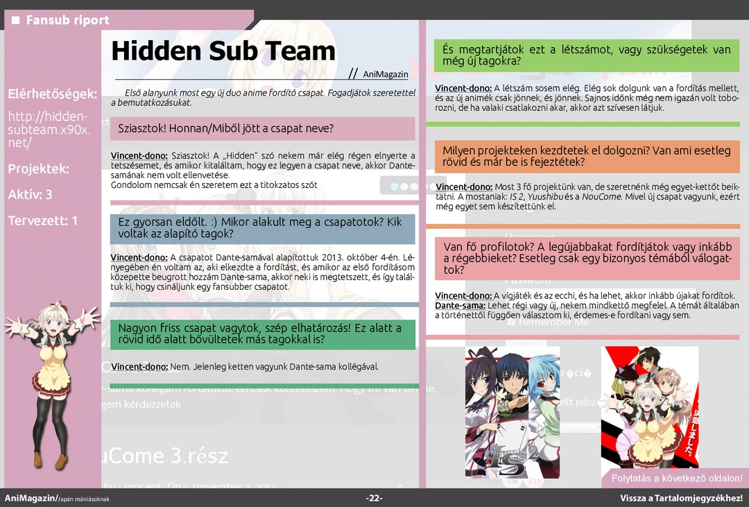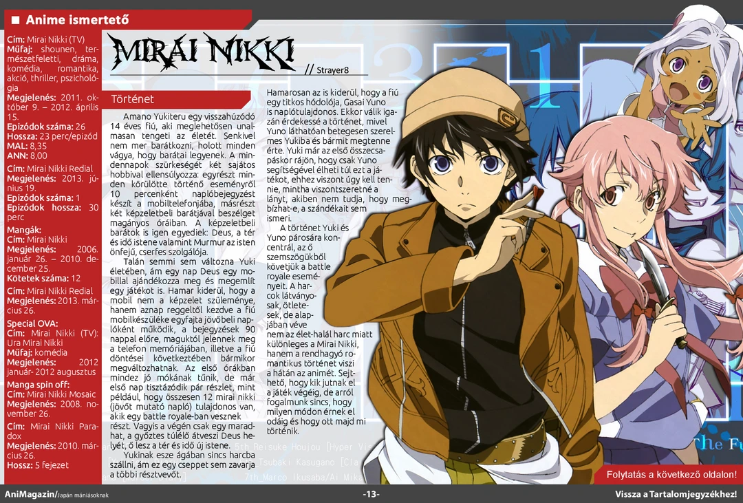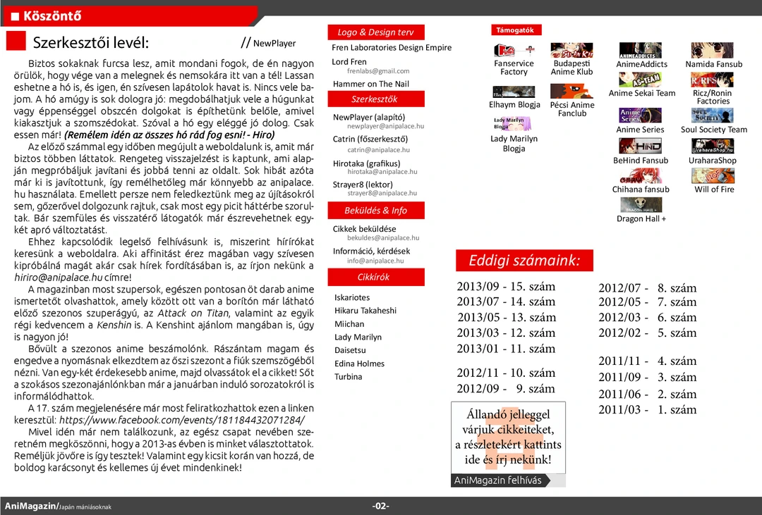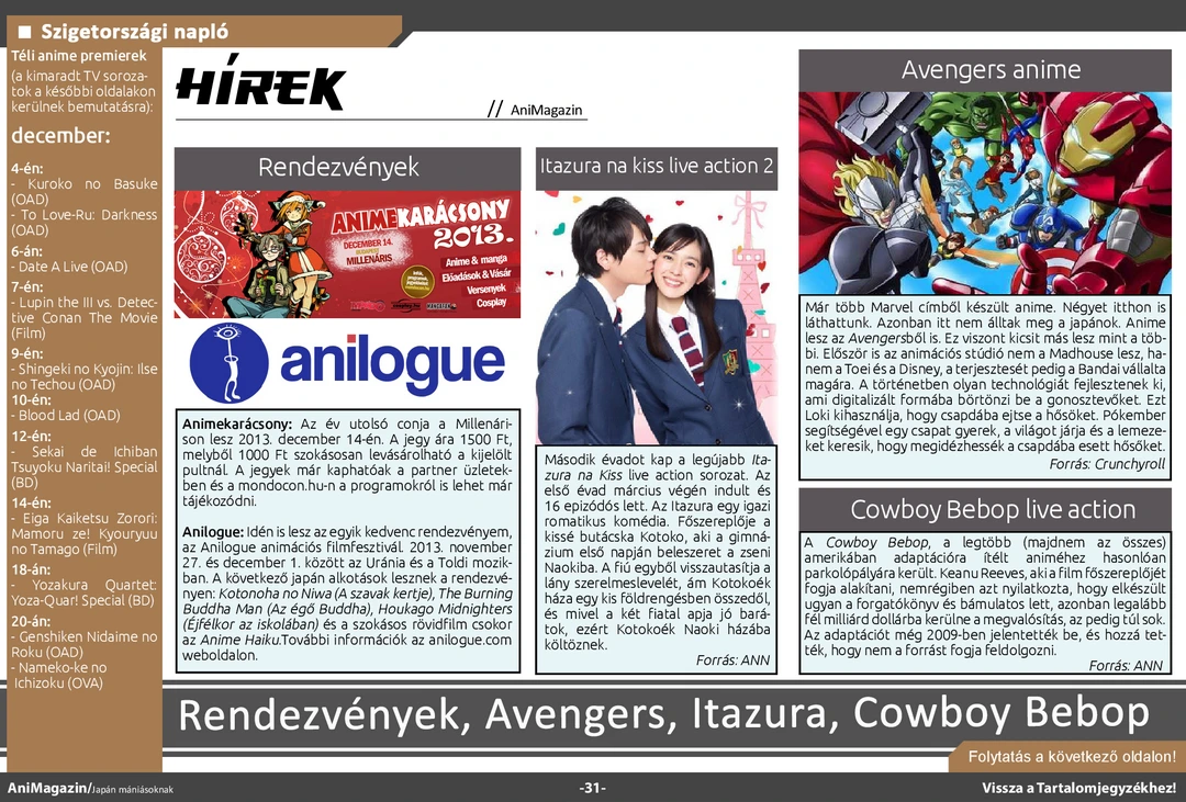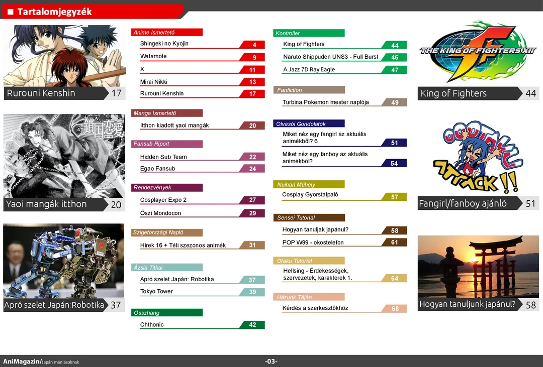 Watamote és Mirai Nikki ismertető, Hidden Sub Team és Egao Fansub interjú, bemutató a Tokyo Towerról, a Chthonic bandáról és a King Of Fightersről, Cosplayer Expo 2 és Őszi Mondocon beszámolók, fangirl&fanboy rovat, téli szezonajánló, hasznos tanácsok japánul tanulóknak és rengeteg más szuper cikk várja olvasóit az ingyenes online AniMagazin legújabb számában!