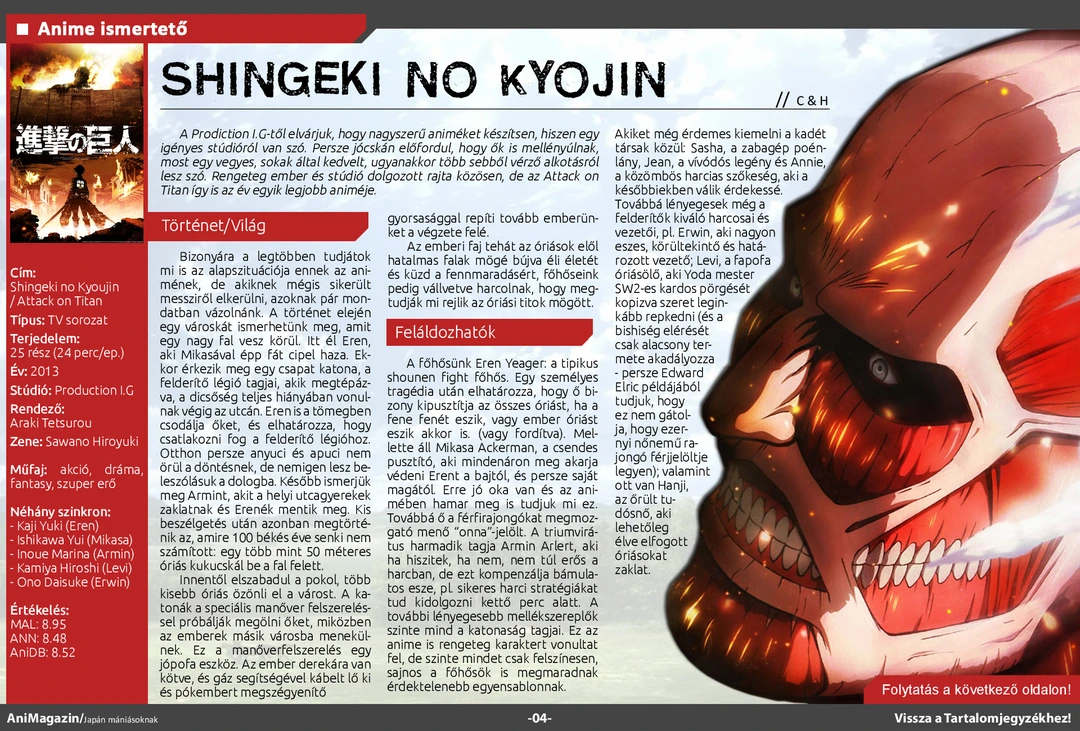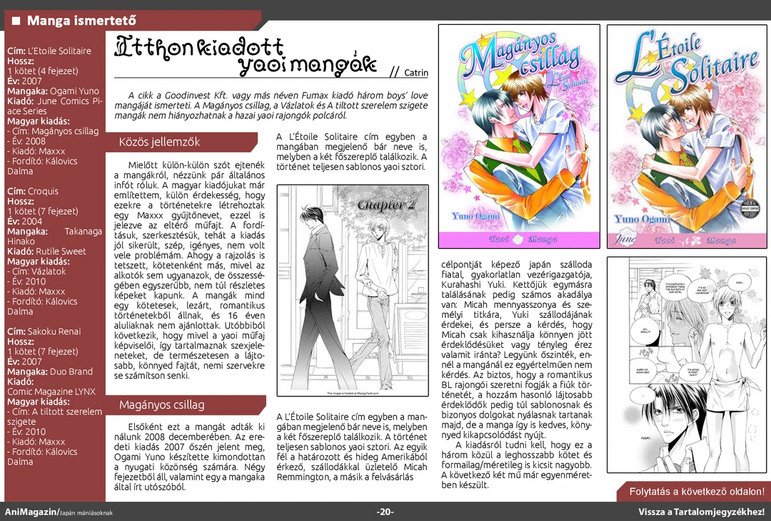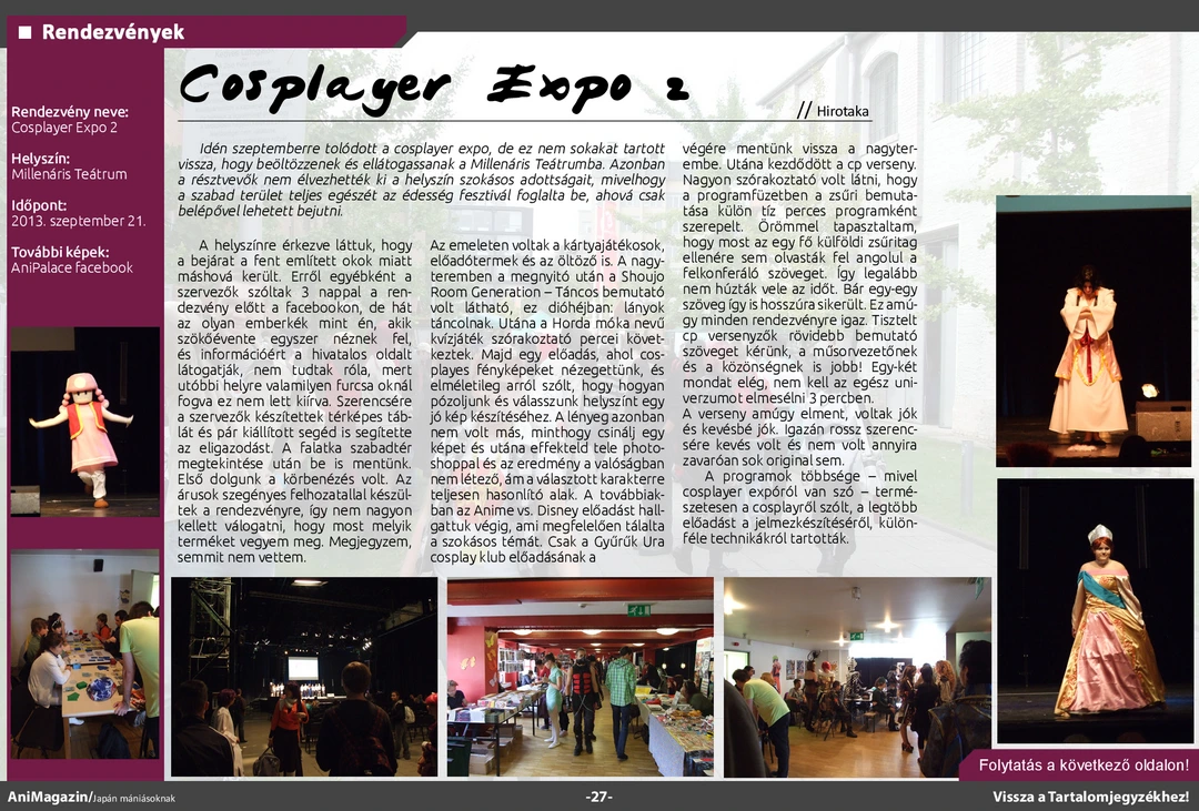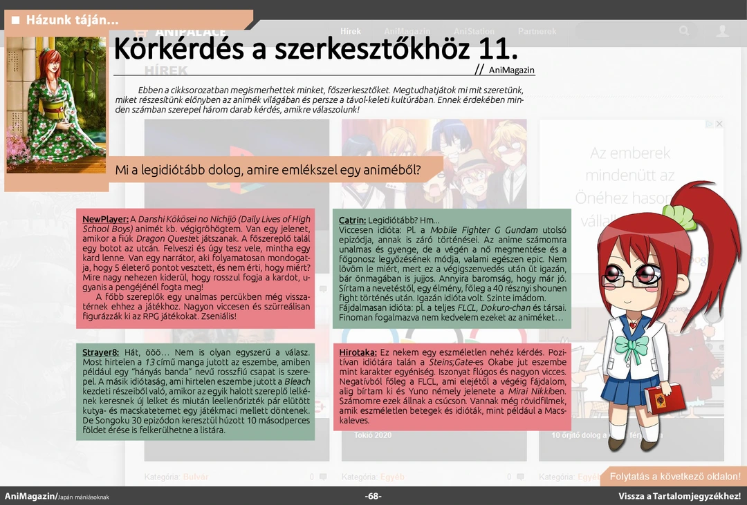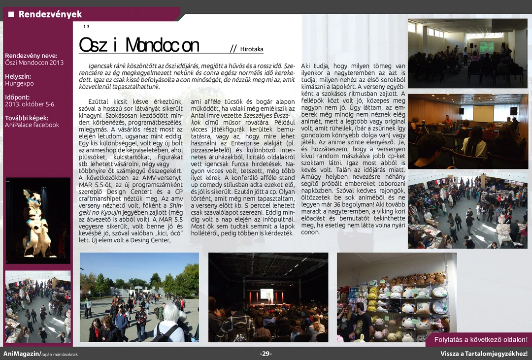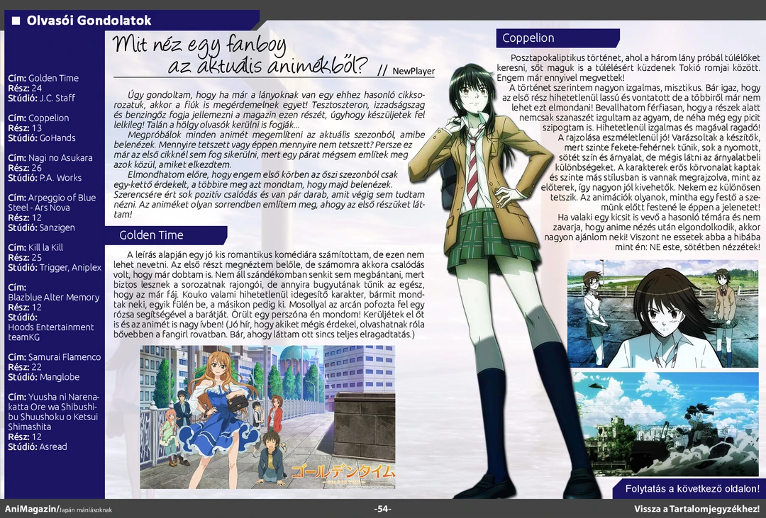 Watamote és Mirai Nikki ismertető, Hidden Sub Team és Egao Fansub interjú, bemutató a Tokyo Towerról, a Chthonic bandáról és a King Of Fightersről, Cosplayer Expo 2 és Őszi Mondocon beszámolók, fangirl&fanboy rovat, téli szezonajánló, hasznos tanácsok japánul tanulóknak és rengeteg más szuper cikk várja olvasóit az ingyenes online AniMagazin legújabb számában!