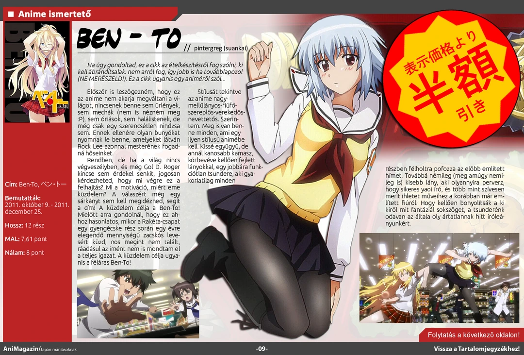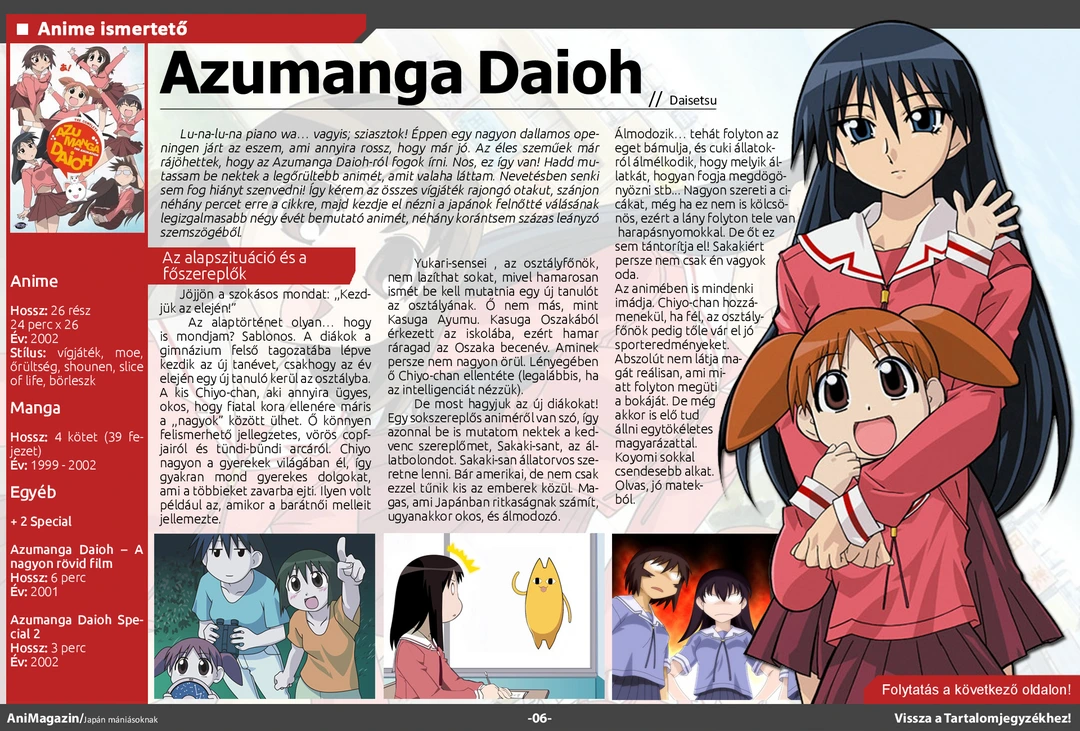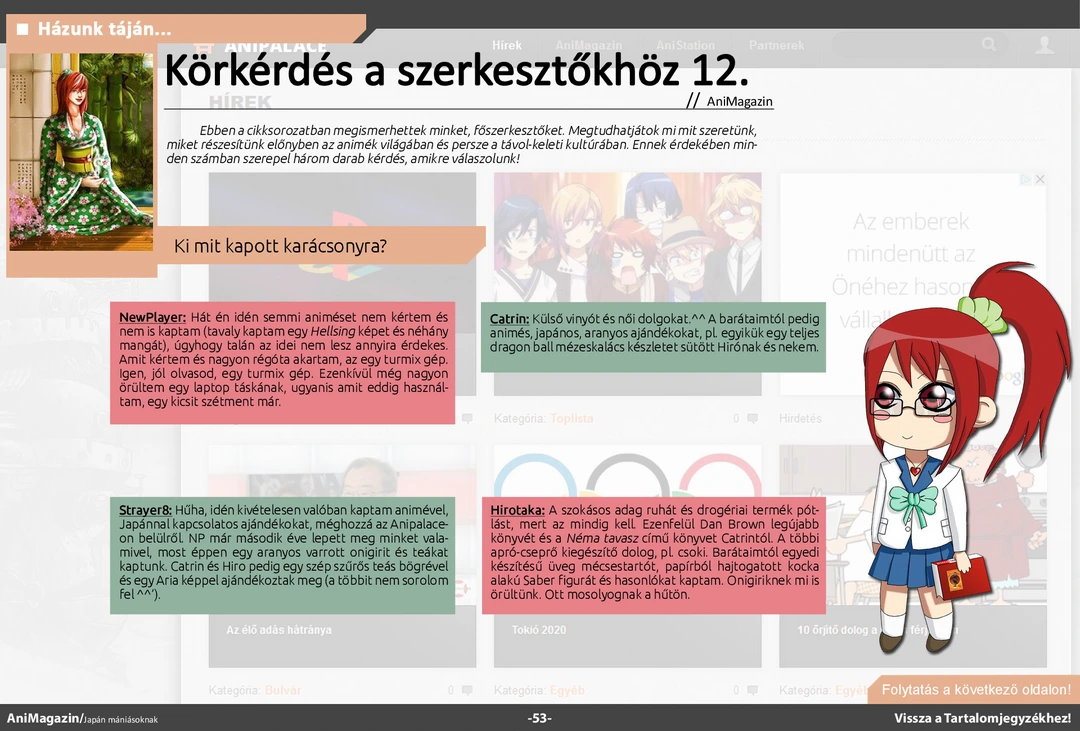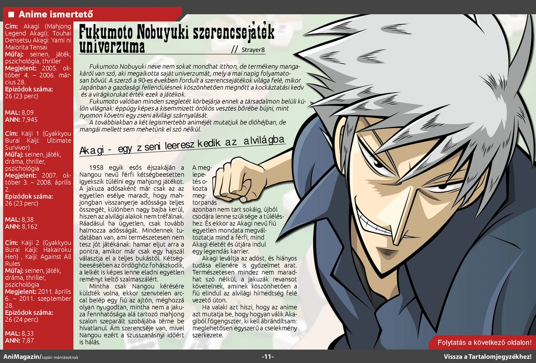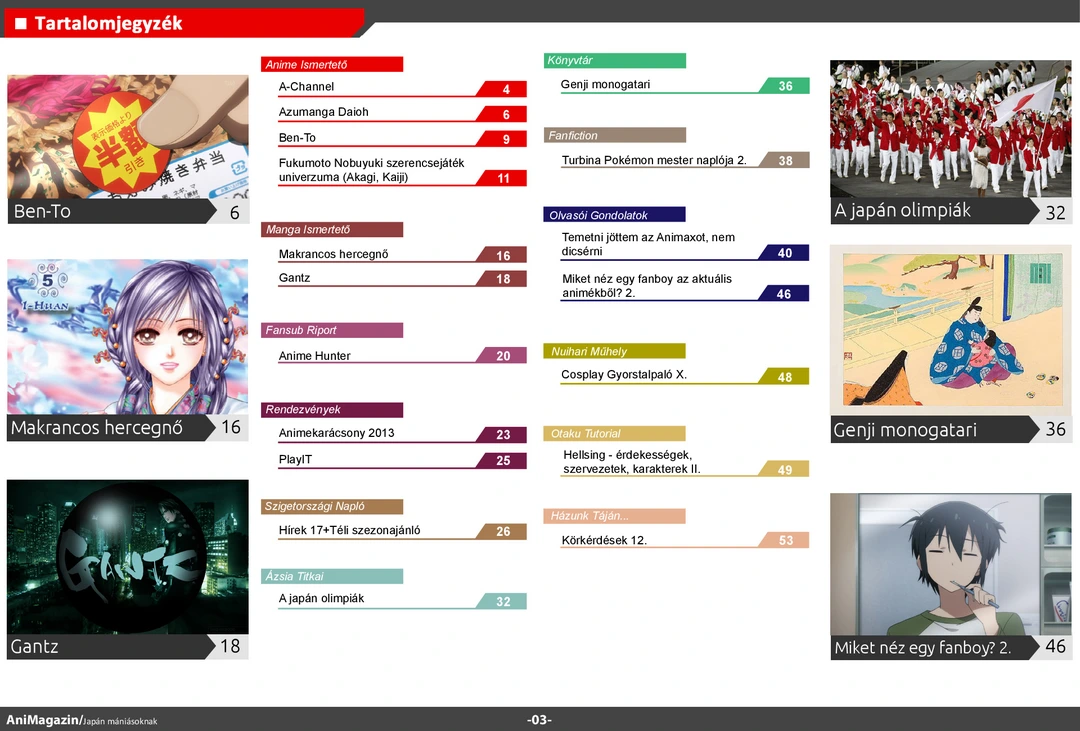 Akagi-Kaiji, Azumanga és Ben-to ismertető, AnimeHunter interjú, bemutató a japán olimpiákról, az Animaxról és a Genji monogatariról, Animekarácsony és PlayIT beszámolók, fanboy rovat és rengeteg más szuper cikk várja olvasóit az ingyenes online AniMagazin legújabb számában!
