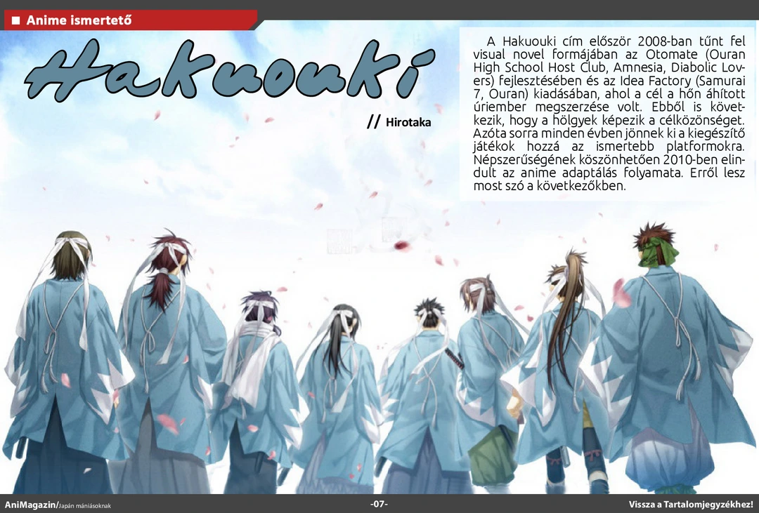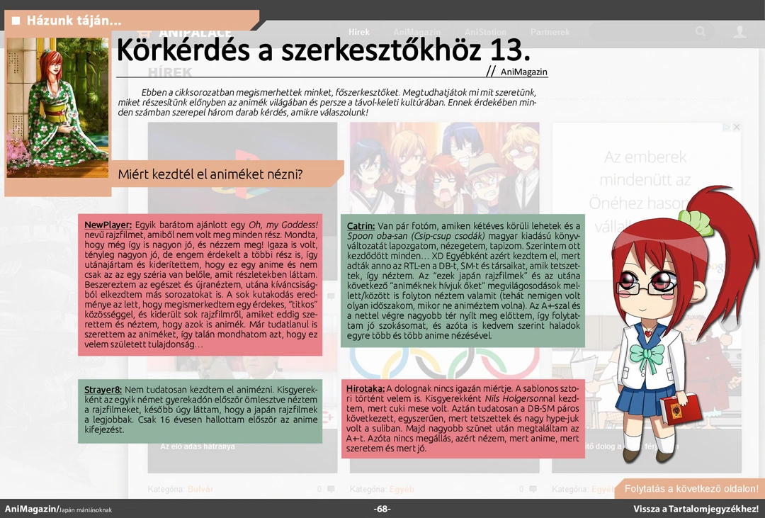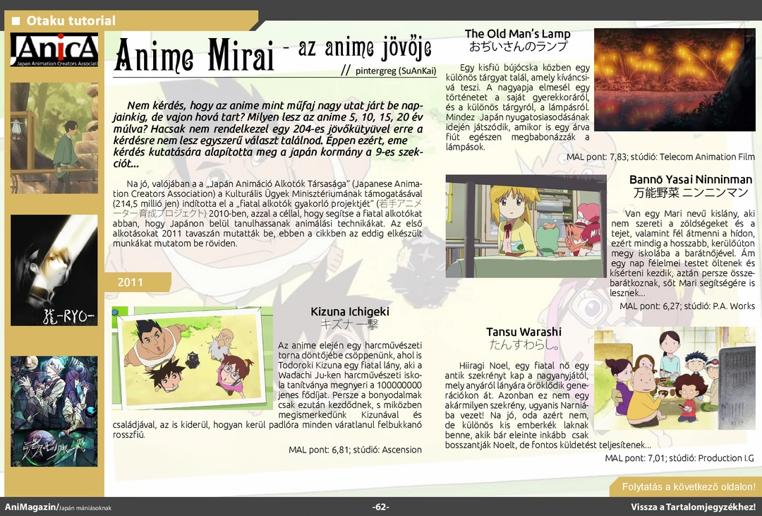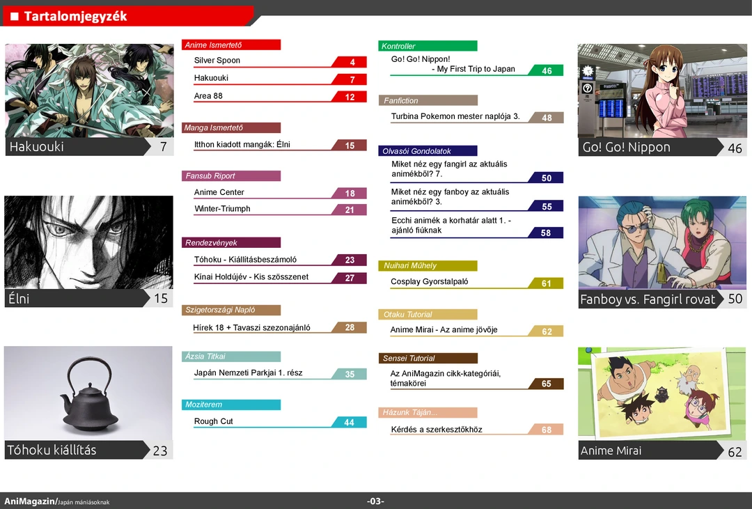 Area88 és Alive! ismertető, Anime Center és Winter-Triumph interjú, bemutató a japán nemzeti parkokról, az Anime Mirairól és a tavaszi szezonról, Tóhoku kiállítás beszámoló, fangirl&fanboy rovat, ecchi ajánló és rengeteg más szuper cikk várja olvasóit az ingyenes online AniMagazin legújabb, szülinapi számában!