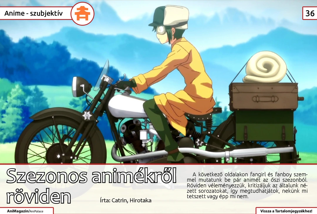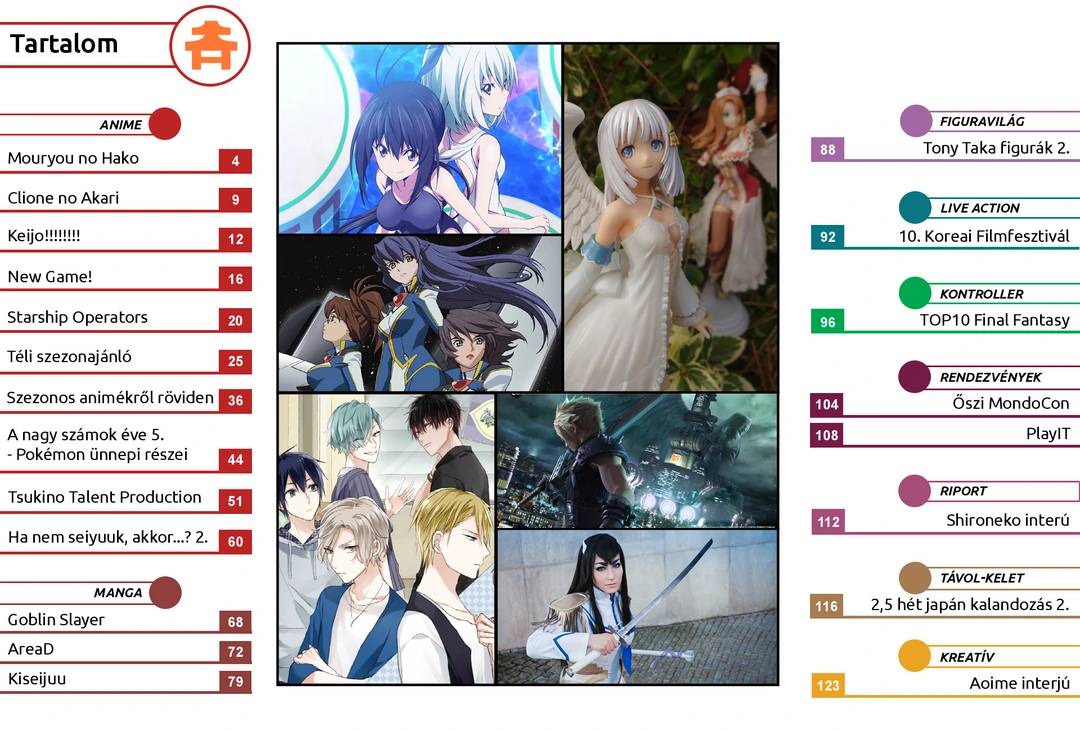 Keijo!!!!!!!!, Starship Operators, Goblin Slayer és Kiseijuu ajánló, Pokémon karácsonyi részek, Tsukino Talent Production és TOP 10 Final Fantasy bemutató, Őszi MondoCon és PlayIT beszámoló, téli szezonajánló, Shironeko és Aoime interjú, Saci (Animológia) beszámolója japán útjáról és további cikkek várnak a 128 oldalas, ingyenes online AniMagazin legújabb számában!