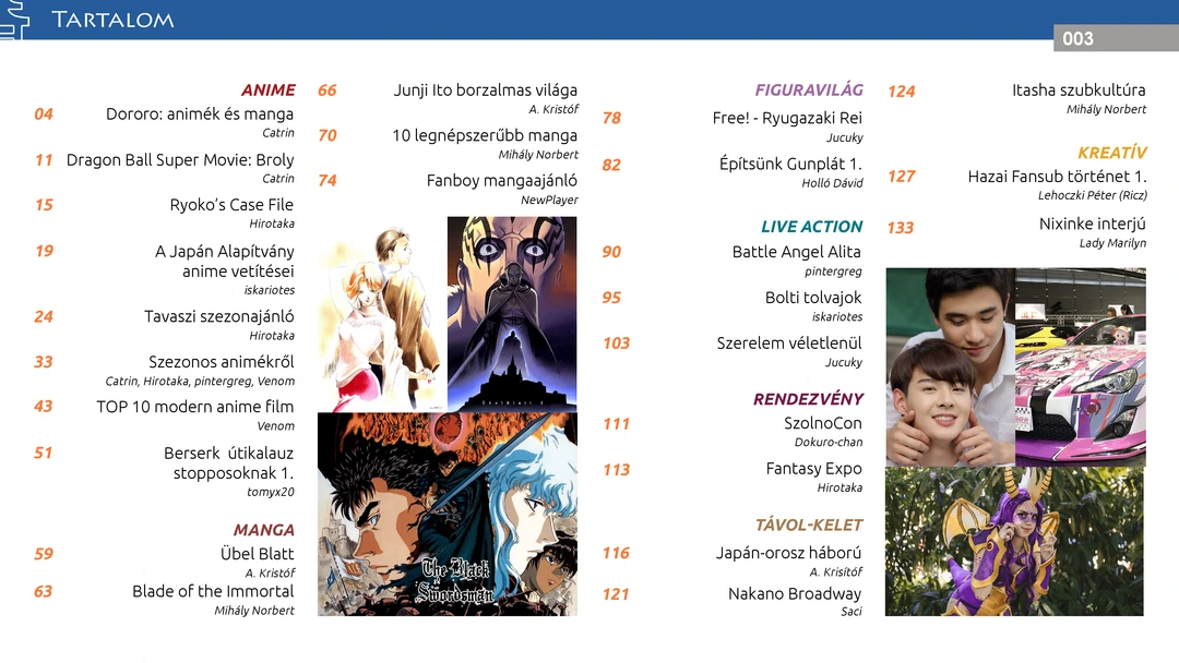 Dragon Ball Super: Broly, Alita, Bolti tolvajok és Love by Chance ajánló, TOP 10 modern anime film és Berserk bemutató, Übel Blatt, Blade of the Immortal, Junji Ito és isekai mangák, tavaszi szezonajánló, Nixinke interjú, Ryugazaki Rei - Free! figura bemutató és Gunpla tutorial, ismertető a japán-orosz háborúról, beszámoló a SzolnoConról és a Fantasy Expóról valamint további remek cikkek az ingyenes online AniMagazin legújabb, szülinapi számában!