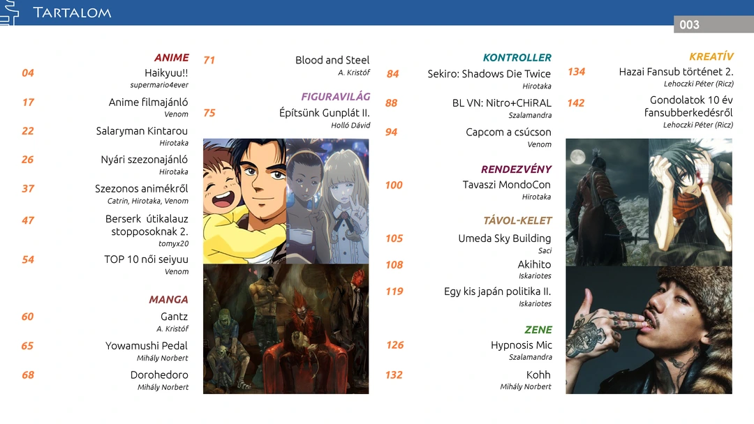 Salaryman Kintarou, Yowamushi Pedal, Blood and Steel és további manga és anime filmajánló, TOP 10 női seiyuu, Berserk és Hypnosis Mic bemutató, nyári szezonajánló, tavaszi szezon vélemények, Gunpla tutorial, Akihito császár és japán párttörténet, Sekiro és Nitro+CHiRAL bemutatók, beszámoló a Tavaszi MondoConról, valamint további remek cikkek az ingyenes online AniMagazin legújabb!