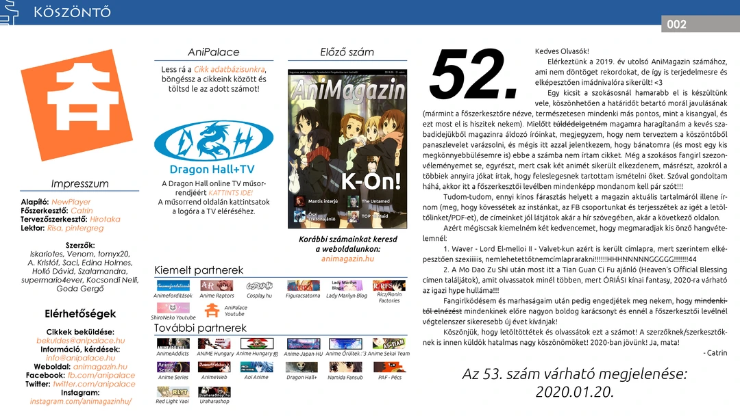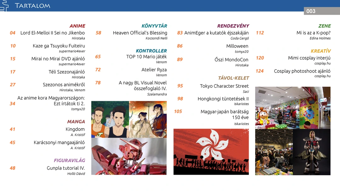 Kaze ga Tsuyoku Fuiteiru anime, Kingdom és karácsonyi témájú mangák ajánló, új rovat indul a K-POP-ról, folytatódik a BL visual novel és Az anime kora Magyarországon cikksorozat, Heaven Official’s Blessing (Tian Guan Ci Fu) könyvismertető, téli szezonajánló, őszi szezon vélemények pl. a Beastarsról, Kabukichou Sherlockról, Mimi cosplay interjú, rendezvénybeszámolók, hongkongi tüntetések folytatás, TOP 10 Mario játék, valamint további remek cikkek az ingyenes online AniMagazin legújabb számában!