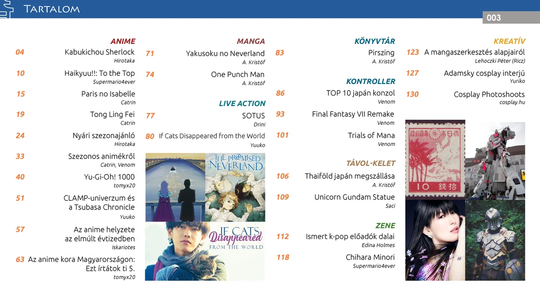 Haikyuu!! TO THE TOP, Paris no Isabelle, Tong Ling Fei és nyári szezonos ajánlók, folytatódik a K-pop rovat és Az anime kora Magyarországon cikksorozat, CLAMP-univerzum, Yu-Gi-Oh! és Az anime helyzete az elmúlt évtizedben bemutatók, Yakusoku no Neverland és One Punch Man manga ajánlók, szezonvélemények többek között az Artéről, Kakushigotóról, BNA-ról, TOP 10 japán konzol, Final Fantasy VII Remake, valamint további remek cikkek az ingyenes online AniMagazin legújabb számában!