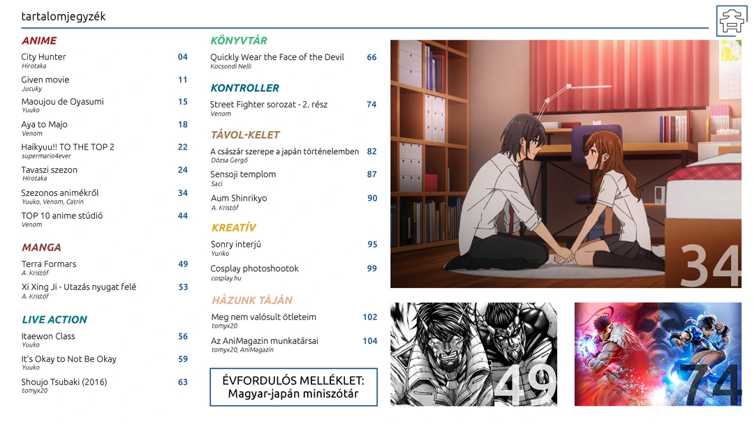 10 éves az AniMagazin, amit többek között dizájnváltással és magyar-japán miniszótár melléklettel ünneplünk. Given movie, Maoujou de Oyasumi, Aya to Majo és tavaszi szezonos ajánlók, TOP 10 anime stúdió, szezonos anime vélemények (pl. Horimiya, Wonder Egg Priority, Thousand Autumns), manga és dorama ajánlók, interjú ismét egy külföldi cosplayerrel - Sonryval, a császár szerepe a japán történelemben ismertető, az évforduló alkalmából bemutatkoznak a magazin állandó munkatársai, és további remek cikkek az ingyenes online AniMagazin legújabb számában!