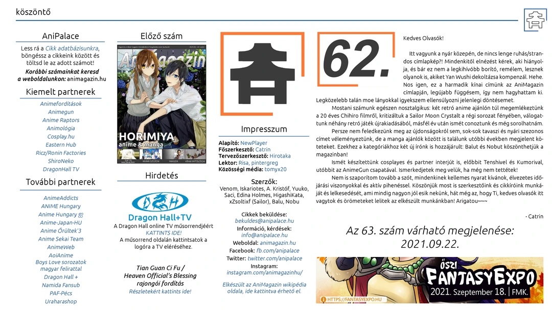 Július 22-én megjelent a magazin 62. száma. Jó szórakozást hozzá!