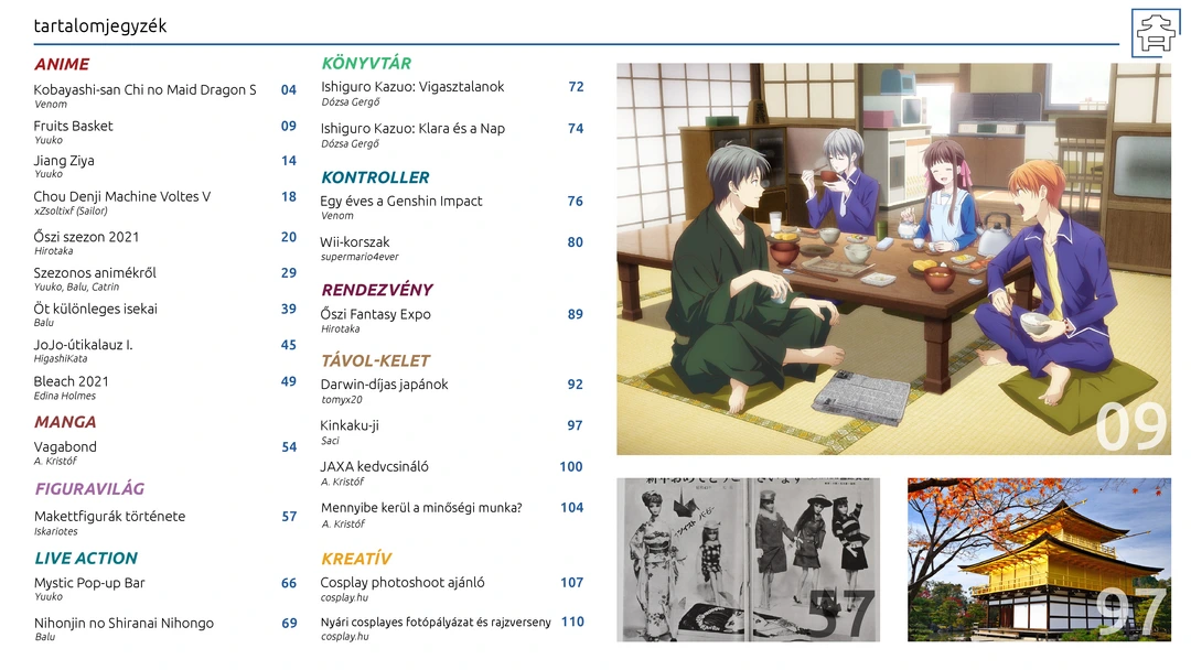 Fruits Basket, Jiang Ziya, Vagabond és őszi szezonos ajánlók, öt különleges isekai, retró rovat, vélemények a nyári szezonos animékről/donghuákról, JoJo, Bleach és figura történeti bemutatók, Genshin Impact és Fantasy Expo beszámoló, manga, dorama és japán könyv ajánlók, tartalmas távol-kelet rovat, nyári cosplayes fotópályázat és rajzverseny eredmények, s további remek cikkek az ingyenes online AniMagazin legújabb számában!